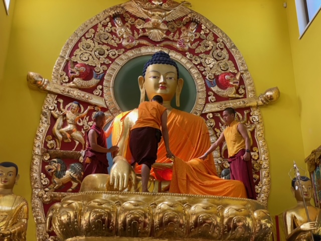 W kwietniu 2024 roku Lama Igor wraz z kilkoma przyjaciółmi postanowił nadać posągowi Buddy, w naszej świątyni w Grabniku, szczególny wyraz – zamówić dla niego nowe szaty, wzorowane na tych, które zdobią posąg w klasztorze Bencien w Katmandu. Pomysł ten szybko zyskał uznanie i wsparcie członków naszej sanghi, którzy z entuzjazmem zaangażowali się w realizację projektu.
