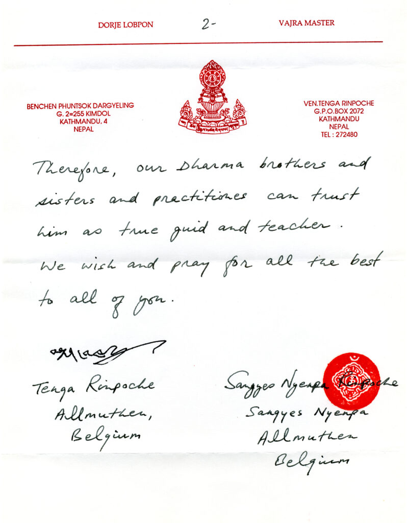 Lama Rinchen was appointed by both Rinpoches as a teacher of this three-year retreat centre (see the letter).